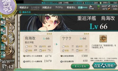 E7攻略に参加していた鳥海が改造可能に。 設計図を消費するだけあって、持参装備が豪華! 鳥海改二ができたので編成任務を1件、達成。 「那智改二」「足柄改二」「多摩」の編成任務が新しく登場。 演習任務も1件増えました。 今日の対戦は全部済ませてしま…