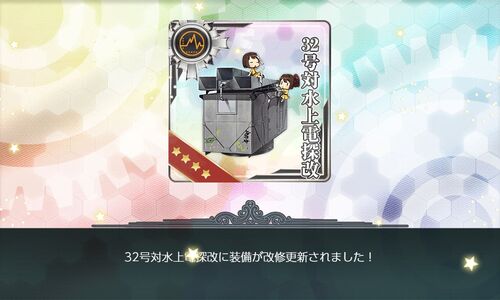 貯まり過ぎた22号水上電探の在庫処分が主目的。 装備図鑑に載りました。 ★6まで改修。 22号水上電探がごっそり減りました。