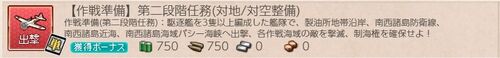 メンテ明けに実装された新任務。 1-3 1-4 任務進捗「50%以上達成」を確認。 2-1 任務進捗「80%以上達成」を確認。 2-2 海防艦2、水母1でルート固定。 任務条件との兼ね合いで「水母1、駆逐3、海防艦2」という軽量編成でボス戦。 思ったほど…