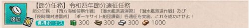 改修材料の52型や流星が足りないので陸攻三四型の改修はしばらくお預け。 演習で豆ゲット。 深雪ちゃん節分モード可愛い。