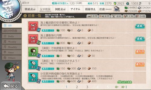 出撃系の定期任務を全て達成。 6-5を攻略します。 1回目、丁字不利でA敗。 ボス戦で航空優勢を取れなかったので戦闘機を積み増し。 丁字不利対策に彩雲も搭載。 2回目、反航戦で完S勝。 反航戦で完S勝できるなら問題なし。 装備と編成が整いました。…