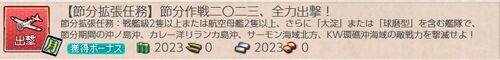 昭南本土航路:7-4 ペナン島沖深部:7-3-2 いつもなら「羽黒、足柄、神風」で最短ルート攻略ですが、今回は「航巡2or水母2」の任務条件で遠回り。 勝てたので問題なし。 任務進捗50%を確認。 タウイタウイ泊地沖深部:7-2-2 任務進捗80% 眠い…