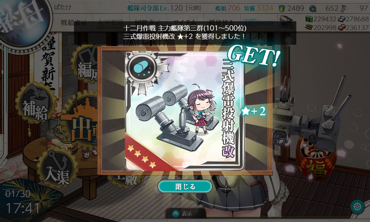 2019-03-27 艦載機演習 艦これ メンテ明けに追加された演習任務。 「春季大演習」やデイリーの「演習5勝」も一緒に遂行。 対戦相手の中にも同じ編成「空母2、駆逐2、+α」の方が居て「同じ任務中だ」と微笑ましく思いました。 3勝で任務達成。 「春季大演習」も4勝で達成。