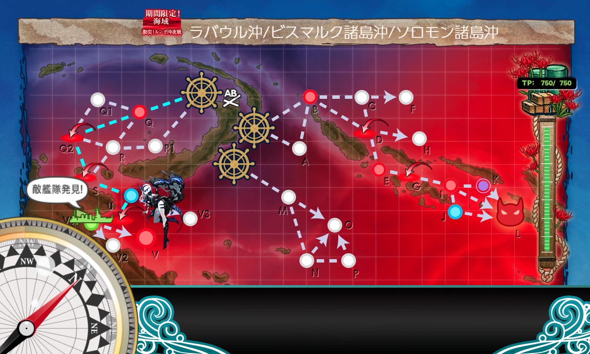 スタート→Q:潜水→Q2:空襲→S:空襲→T:分岐→U:空襲→V1:揚陸→V:ボス、と進行。