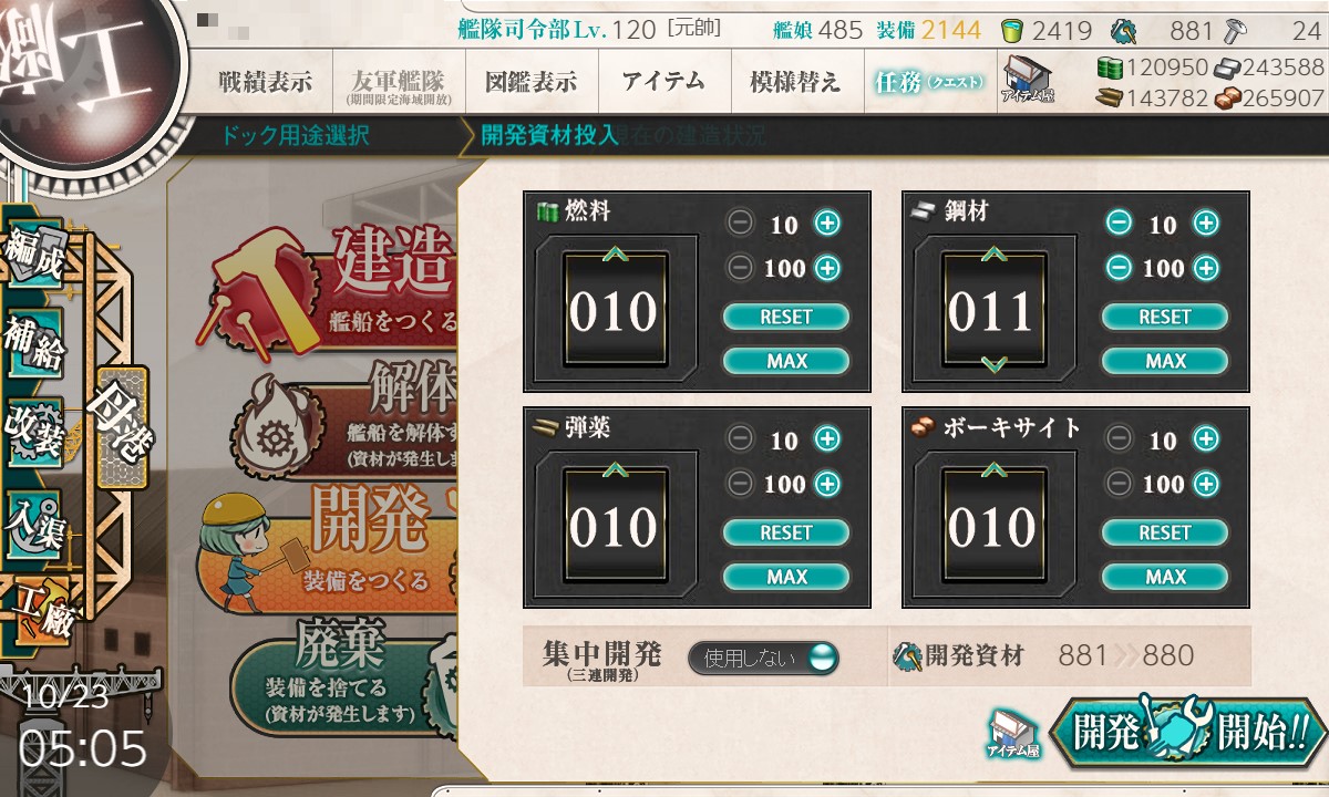 次の改修更新に必要な「12.7mm単装機銃」を3個準備するため、明日からはまた睦月を秘書官でデイリー開発します。