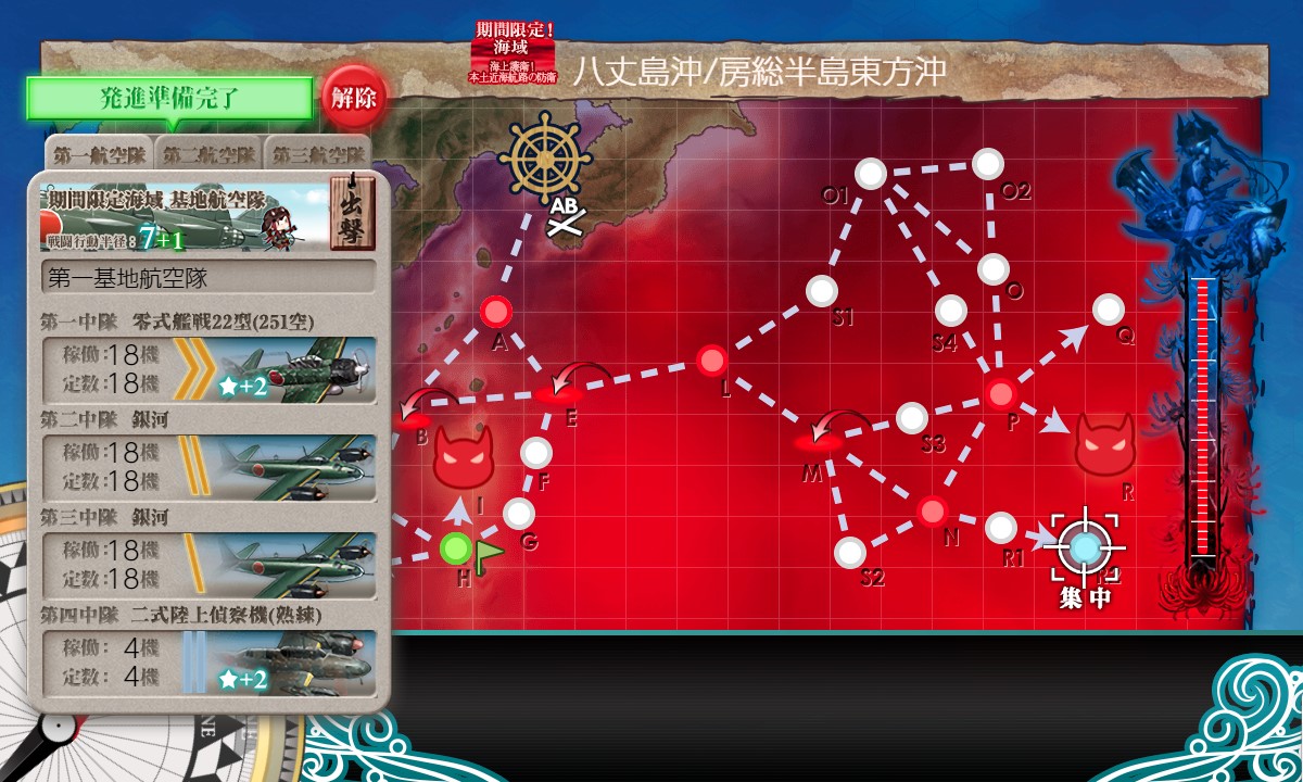 スタート→J:戦闘無し→B:空襲→E:空襲→L:能動分岐→M:空襲→N:水上→R1:潜水、と進行。