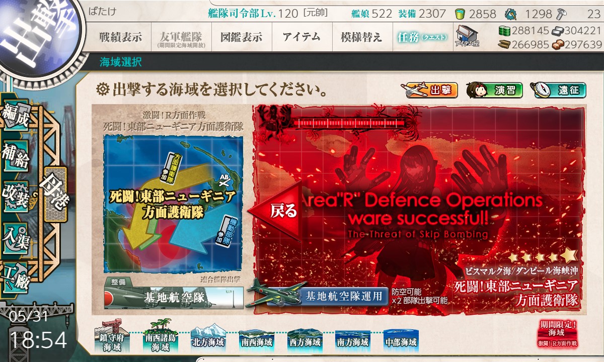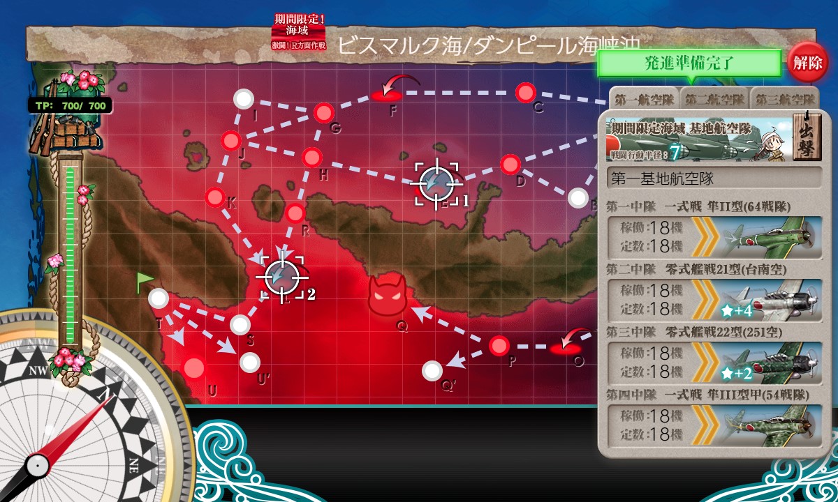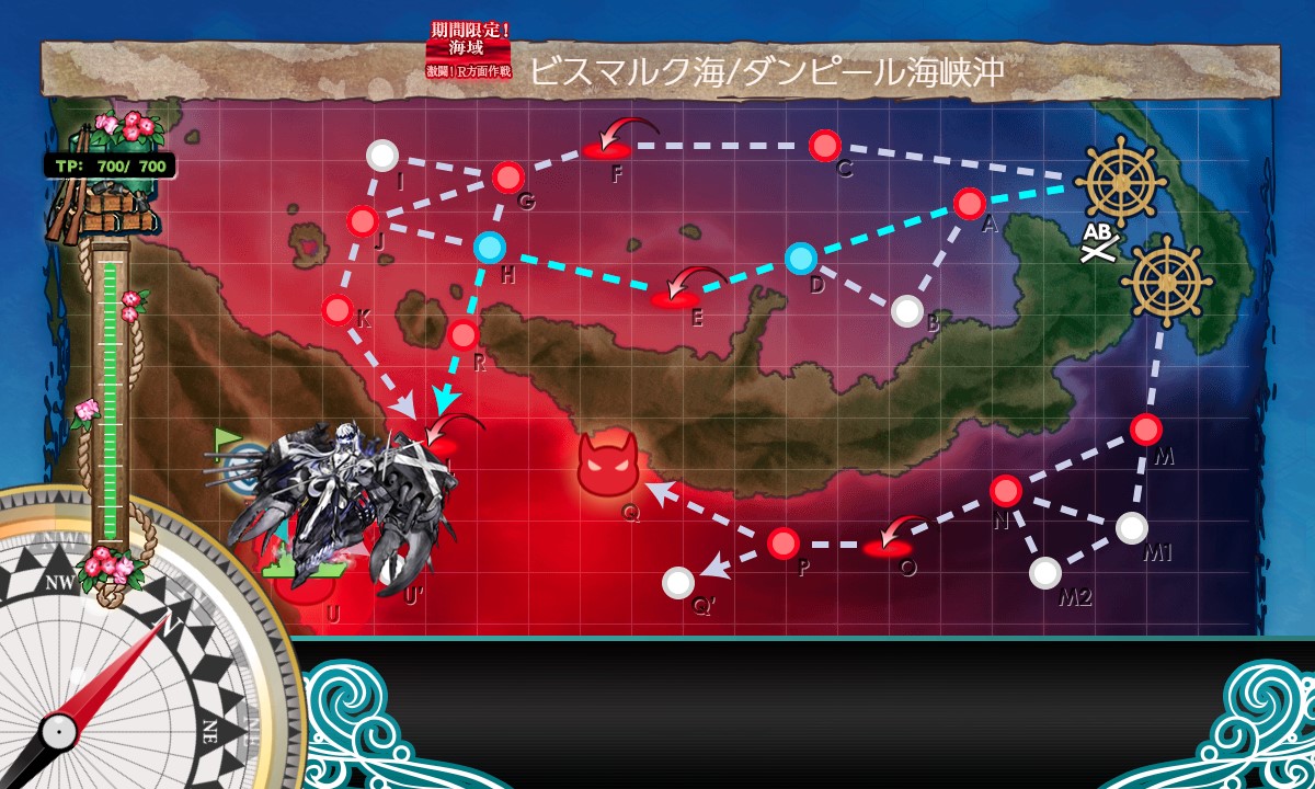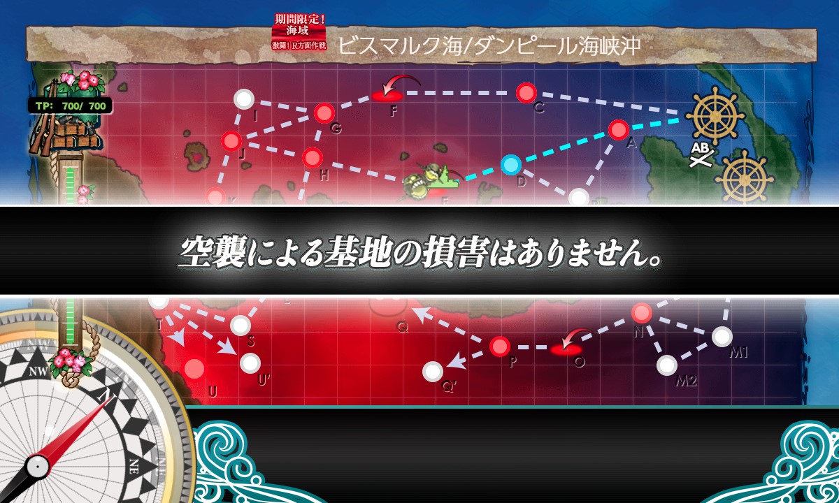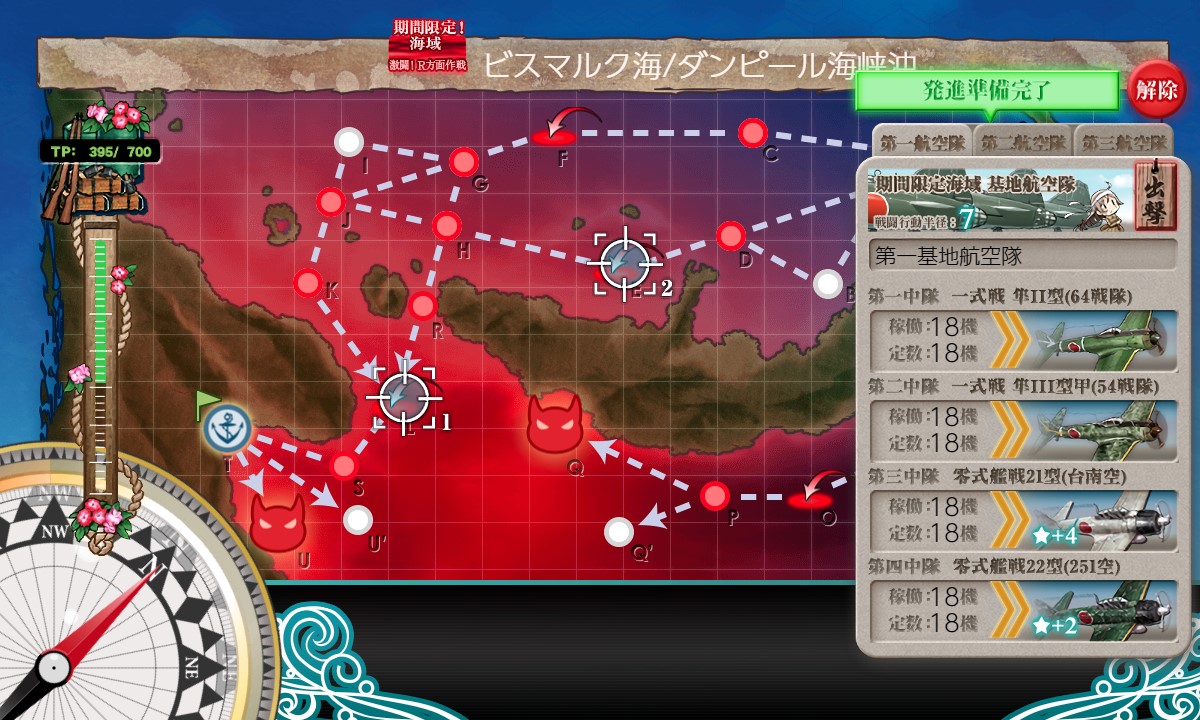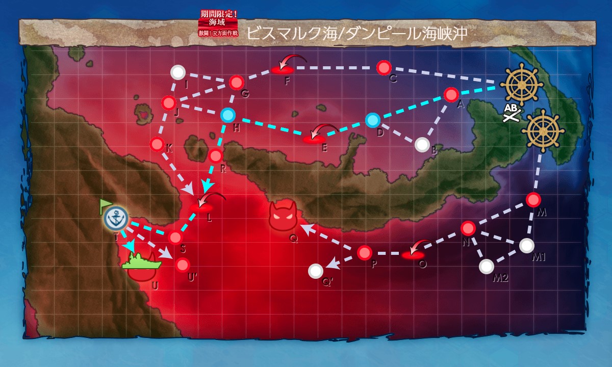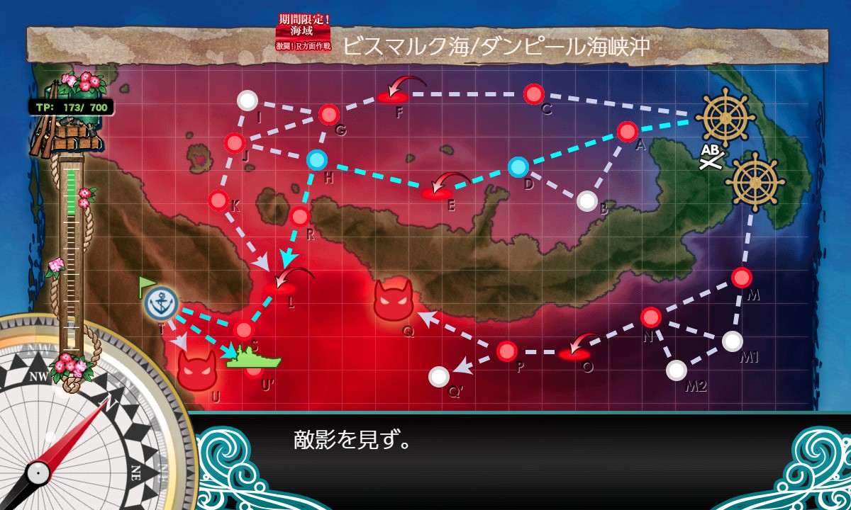 スタート→A:潜水→D:戦闘無し→E:空襲→H:戦闘無し→R:PT小鬼→L:空襲→S:水上艦+潜水艦混成→T:揚陸ポイント→U:ボス、と進行。