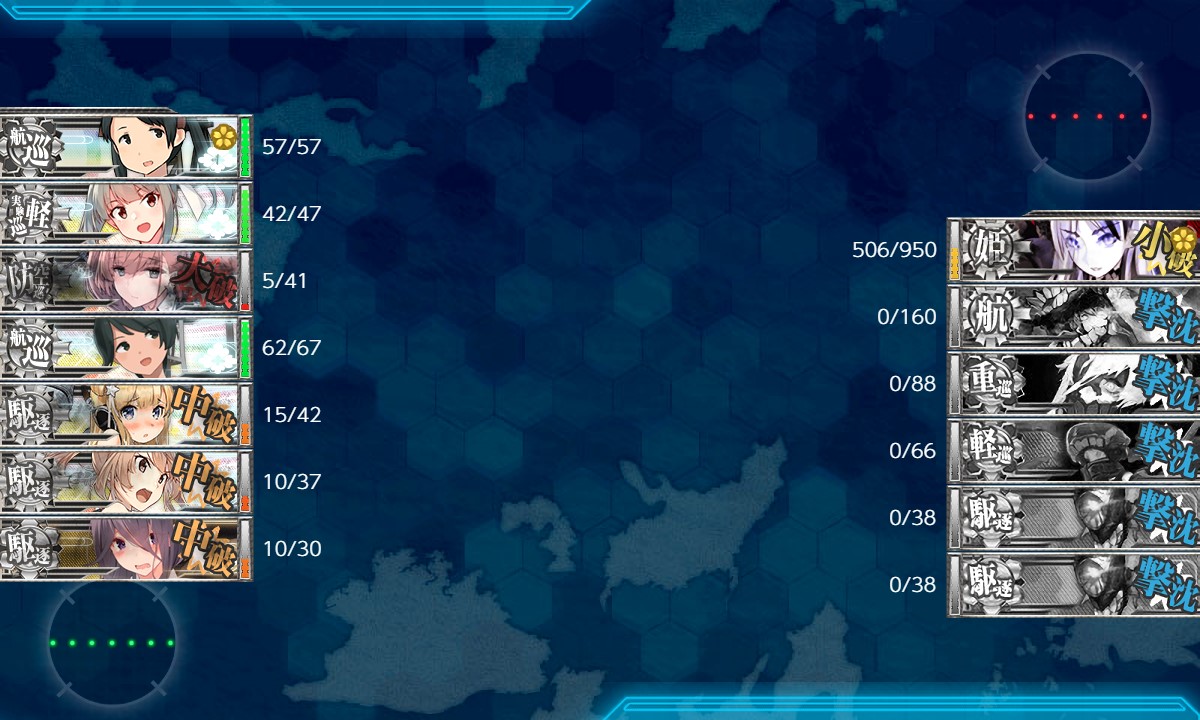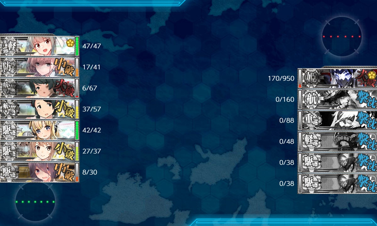 9回目、同航戦でA勝。TP84/残173。ドロップ無し。