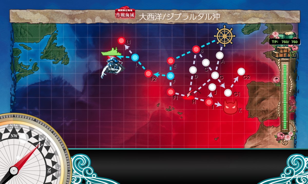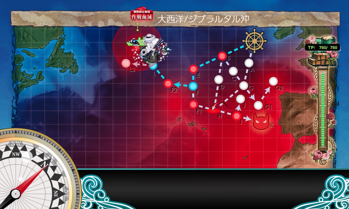 スタート→B:潜水(単横陣)→E:水上(警戒陣)→F:能動分岐→F2:水上(警戒陣)→L:能動分岐、と進行。
