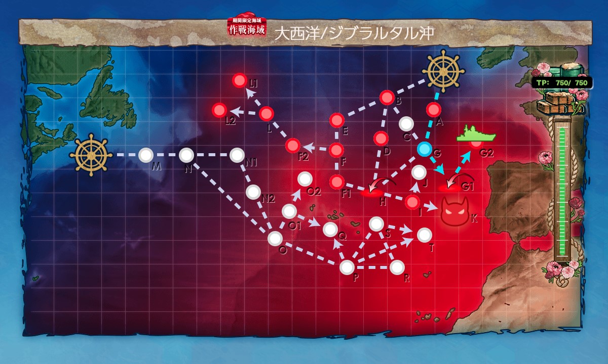 スタート→A:潜水(単横陣)→G:能動分岐→G1:空襲(警戒陣)→G2:潜水(単横陣)と進行。
