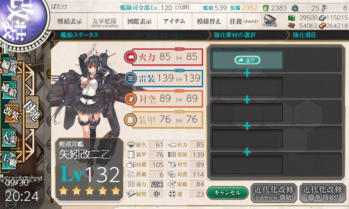 海防艦を消費して矢矧の運(対潜)改修。