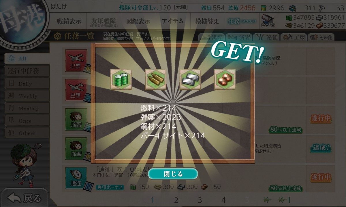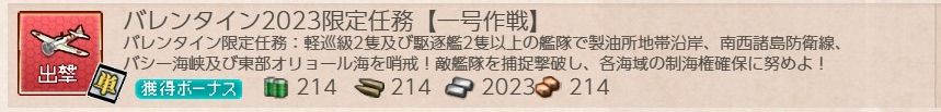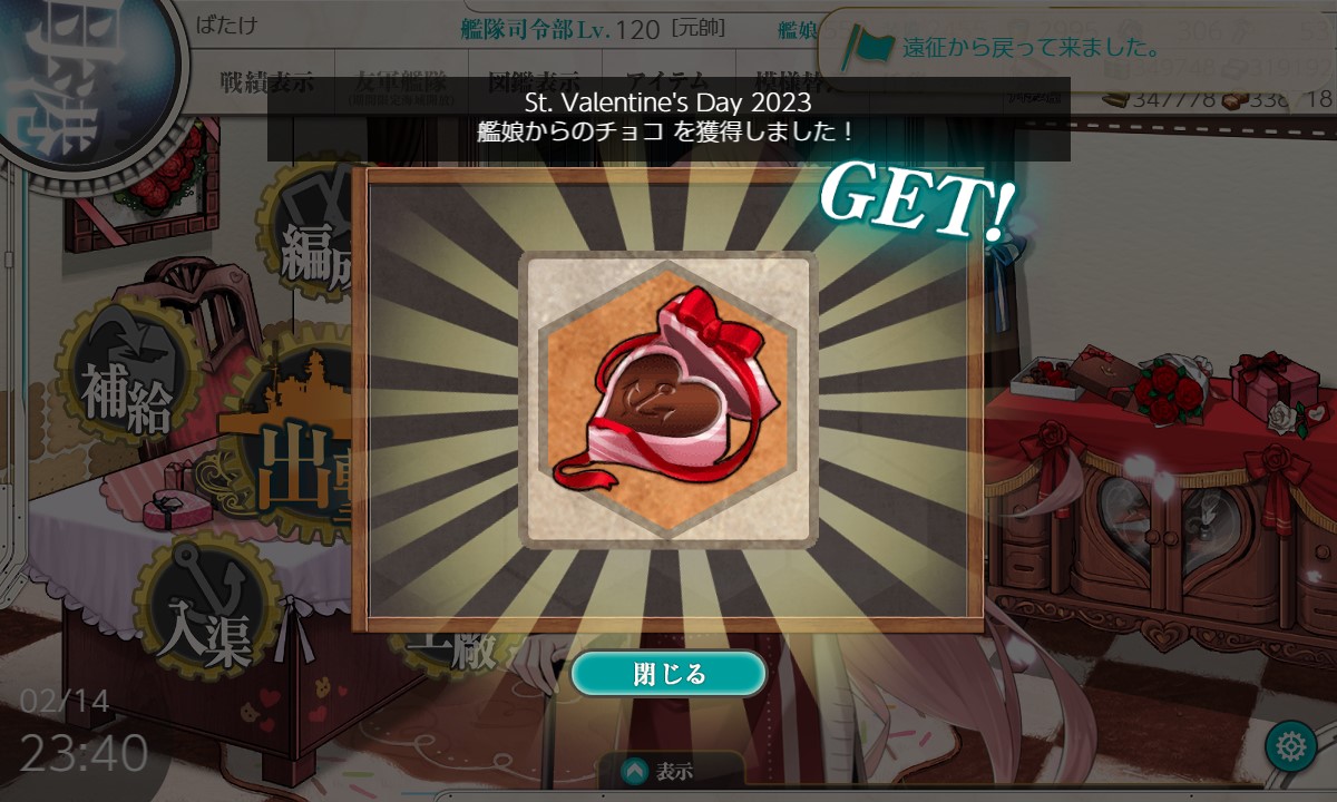 2023-02-15 メンテ明け 艦これ 当初の予定よりかなり遅れましたが、無事メンテが明けました。 バレンタイン演習S勝4回、対戦相手がガチ装備の泊地修理で結構ギリギリでした 新しく実装された家具で飾ってみました 出撃任務 工廠任務 新しく実装された任務がありますが、もう遅いので続きは明日以降に