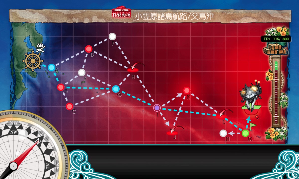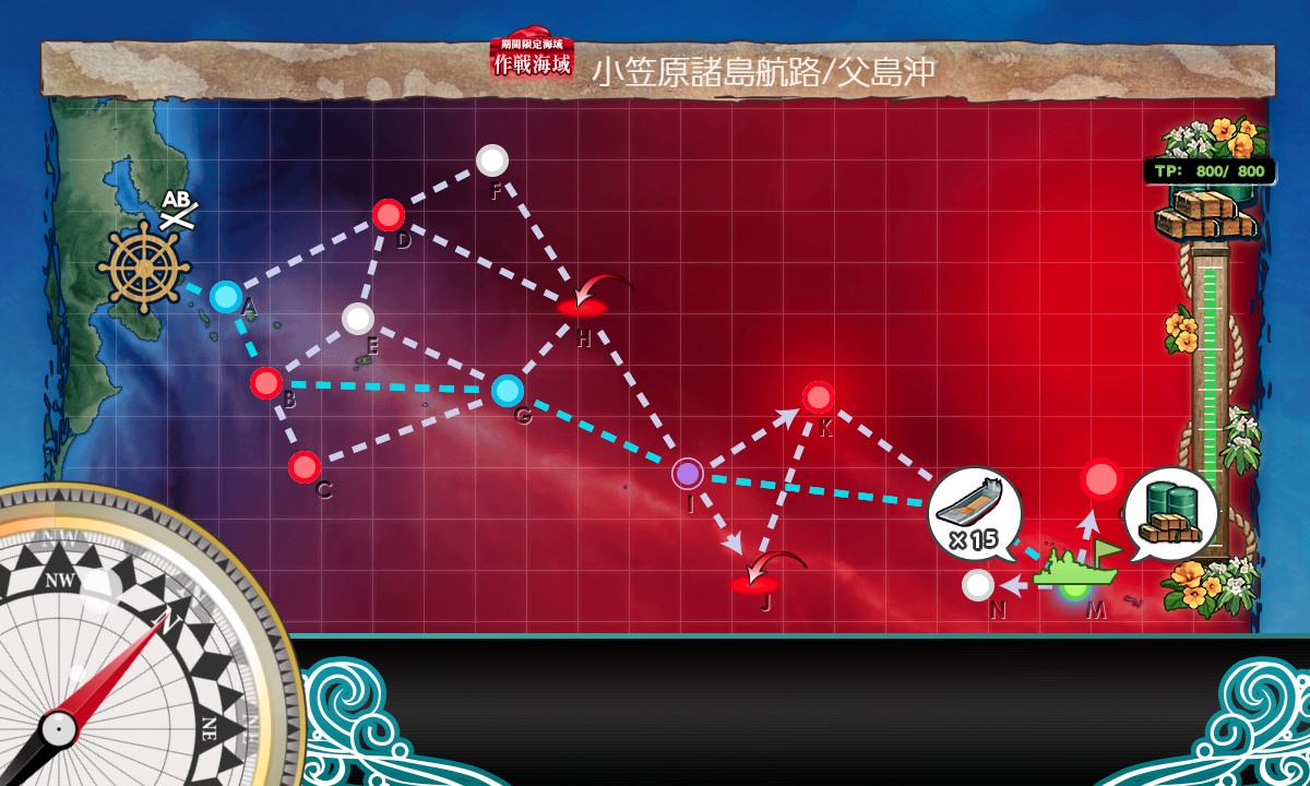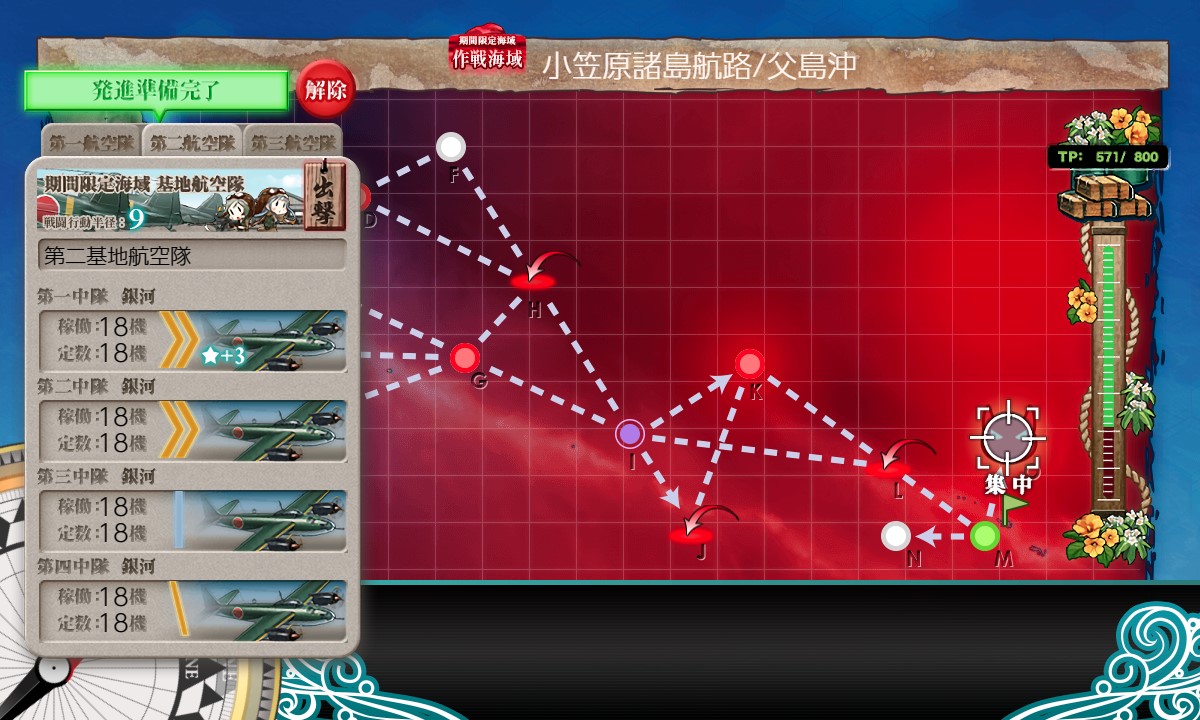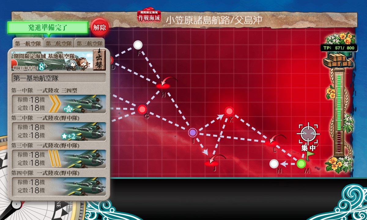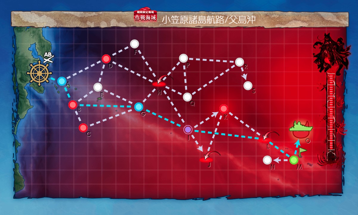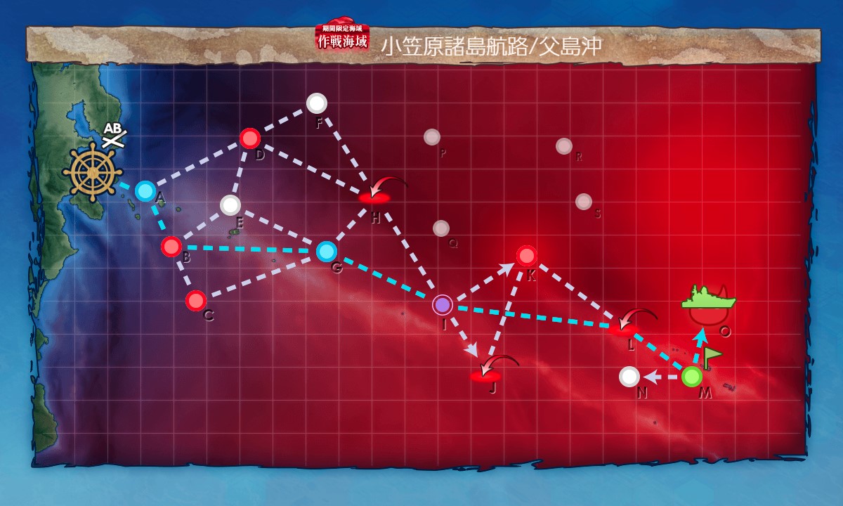 スタート→A:能動分岐→B:潜水→G:能動分岐→I:夜戦→L:空襲→M:揚陸ポイント、と進行