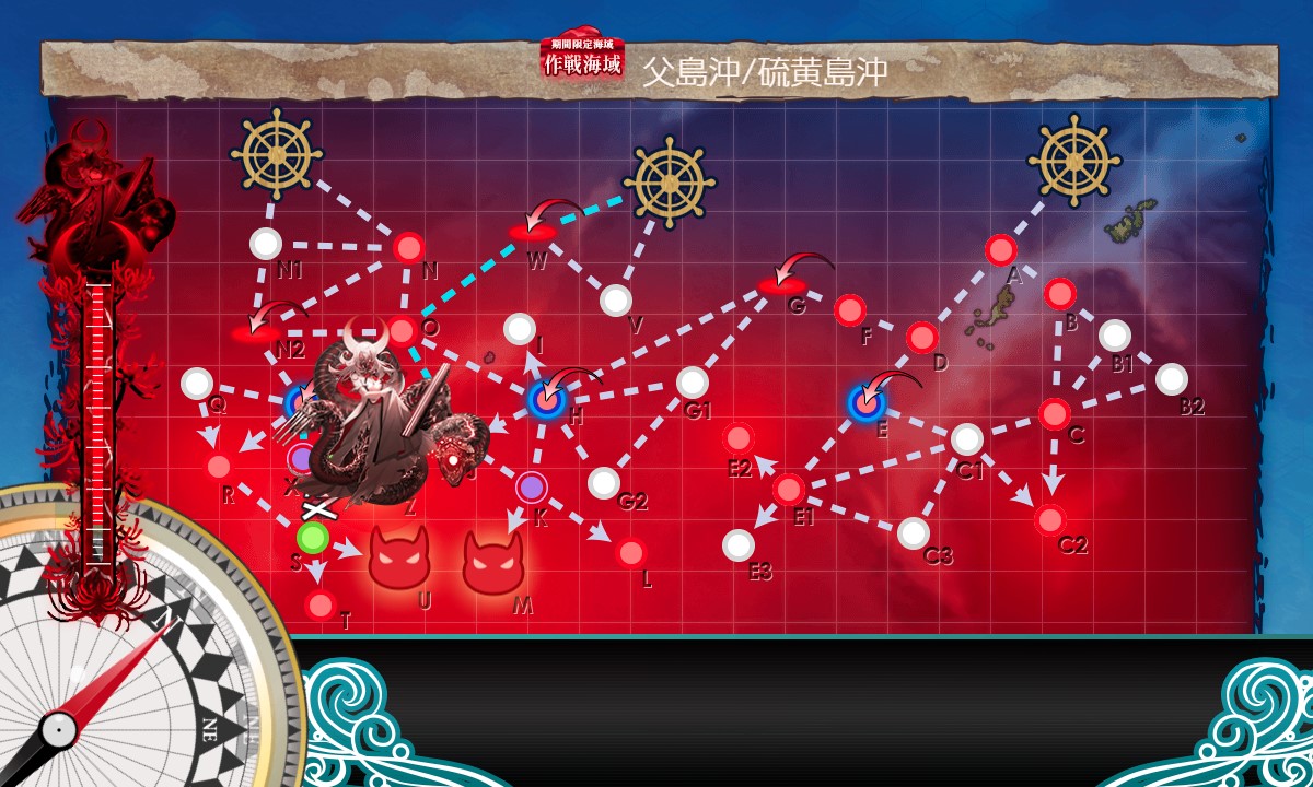 スタート→W:空襲→O:水上→N2:空襲→P:潜水空襲→X:水上(夜戦)→Z:ボス、と進行