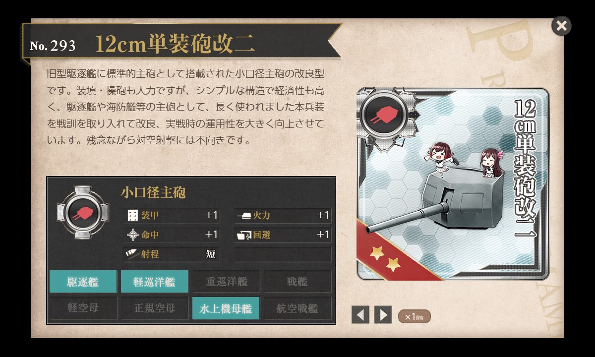 改修材料は★5までが「12cm単装砲」×2、★6~は「22号対水上電探」×1ですか