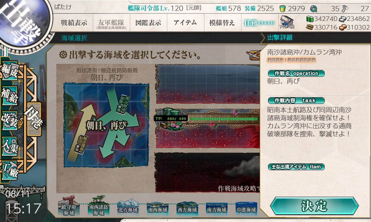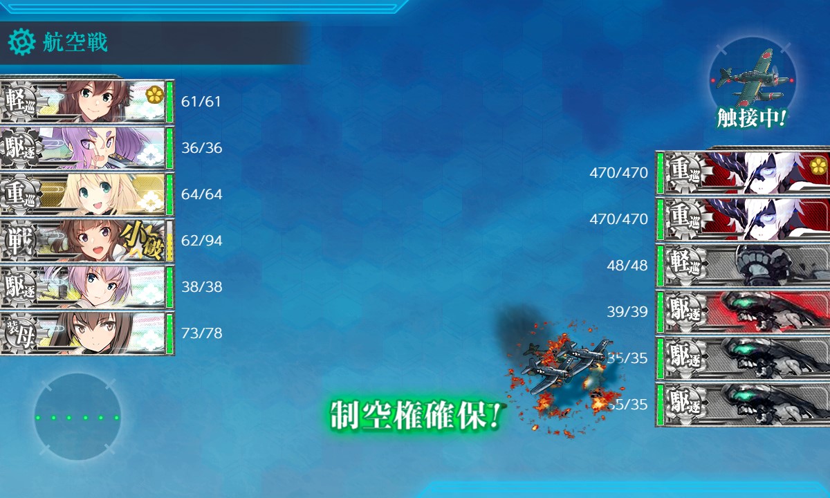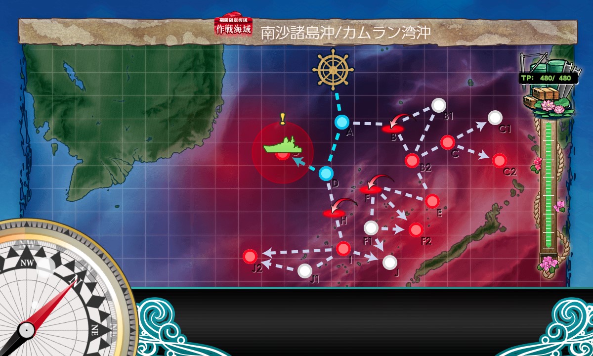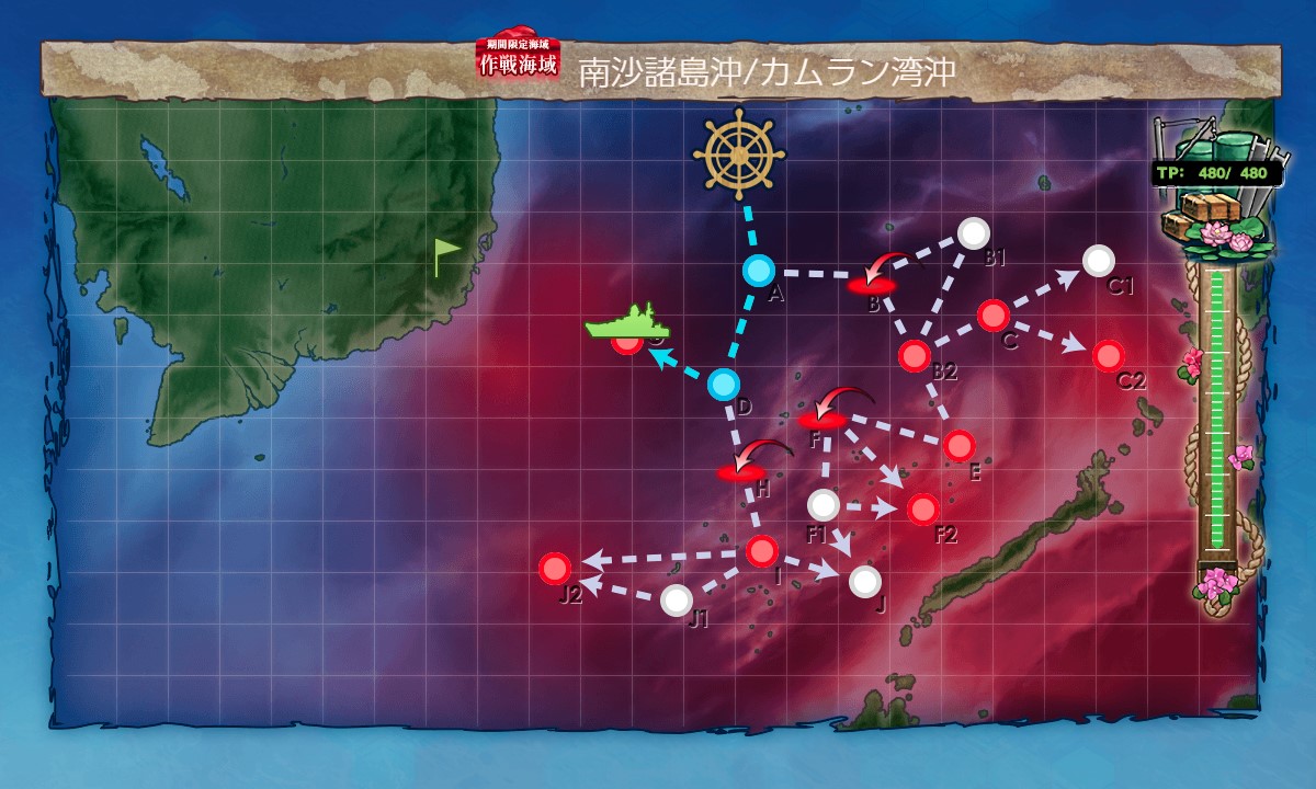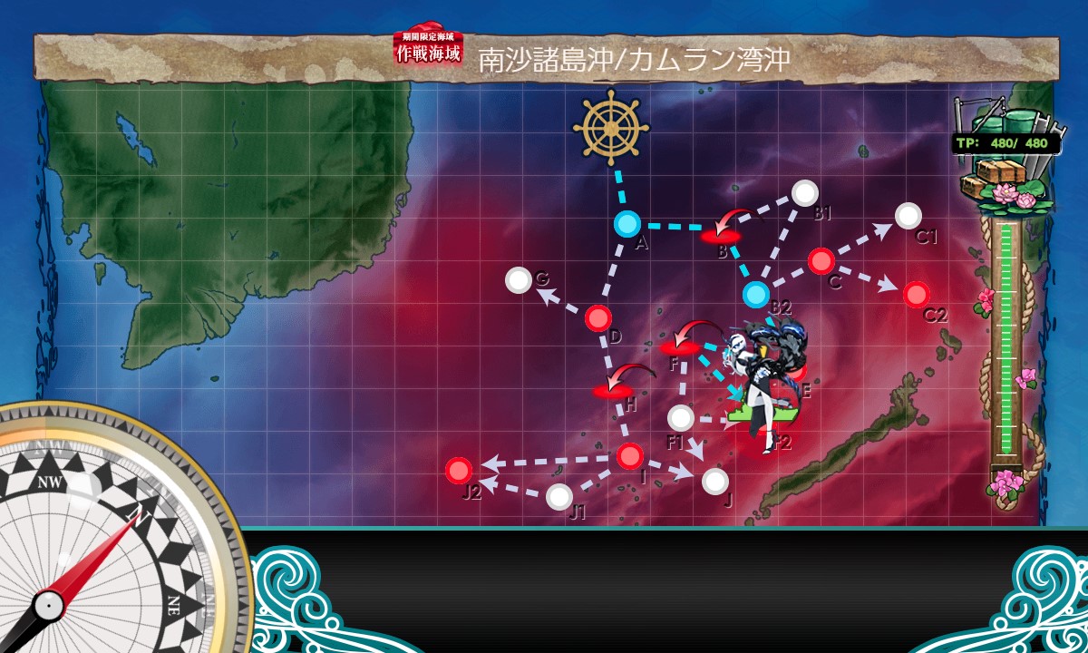 スタート→A:能動分岐→B:空襲(輪形陣)→B2:能動分岐→E:潜水(単横陣or警戒陣)→F:空襲(輪形陣)→F2:水上(単縦陣)、と進行