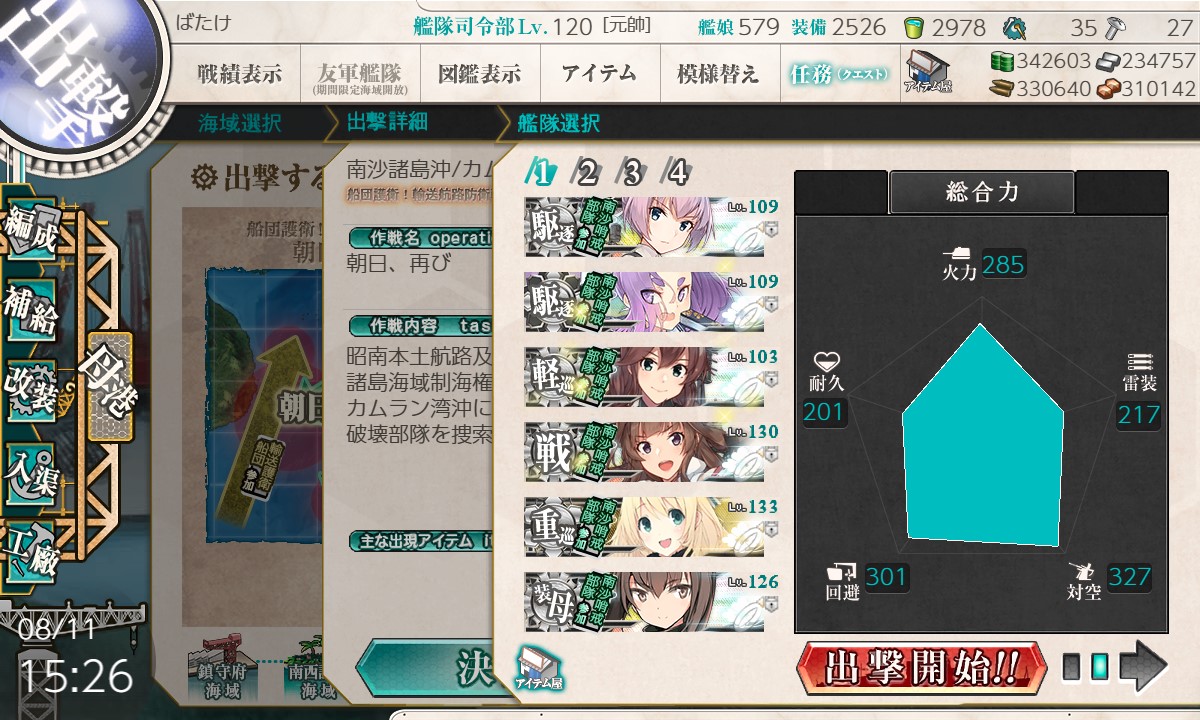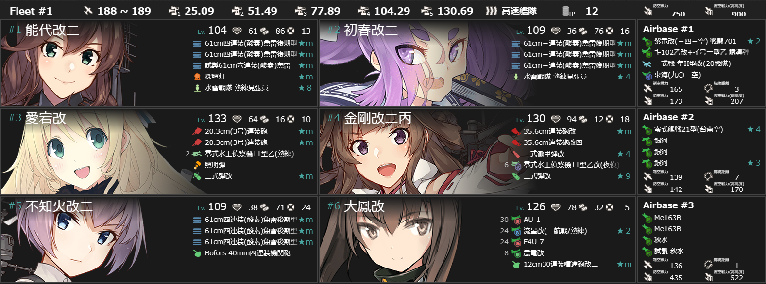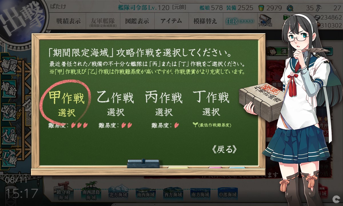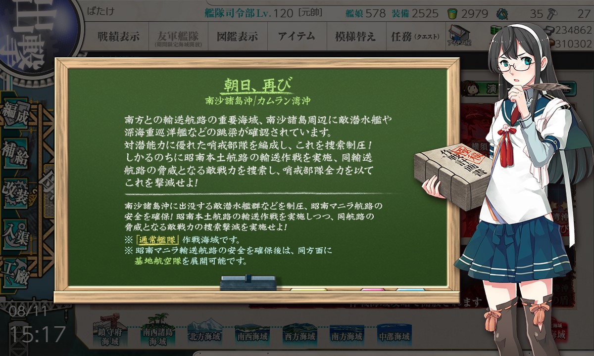 スタート→A:能動分岐→B:空襲(輪形陣)→B2:能動分岐→E:潜水(単横陣or警戒陣)→F:空襲(輪形陣)→F2:水上(単縦陣)、と進行