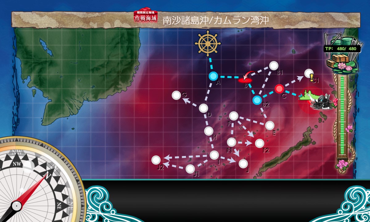 スタート→A:能動分岐→B:空襲(輪形陣)→B2:能動分岐→C:水上(警戒陣)→C2:潜水(単横陣)、と進行