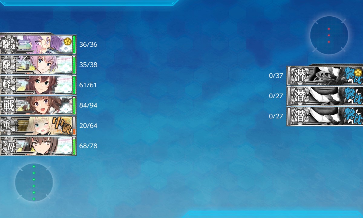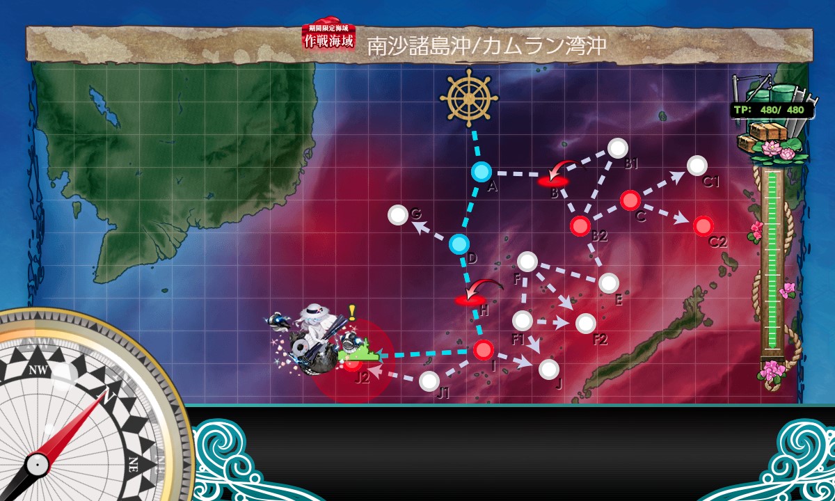 スタート→A:能動分岐→D:能動分岐→H:空襲(輪形陣)→I:水上(警戒陣)→J2:潜水(単横陣)、と進行