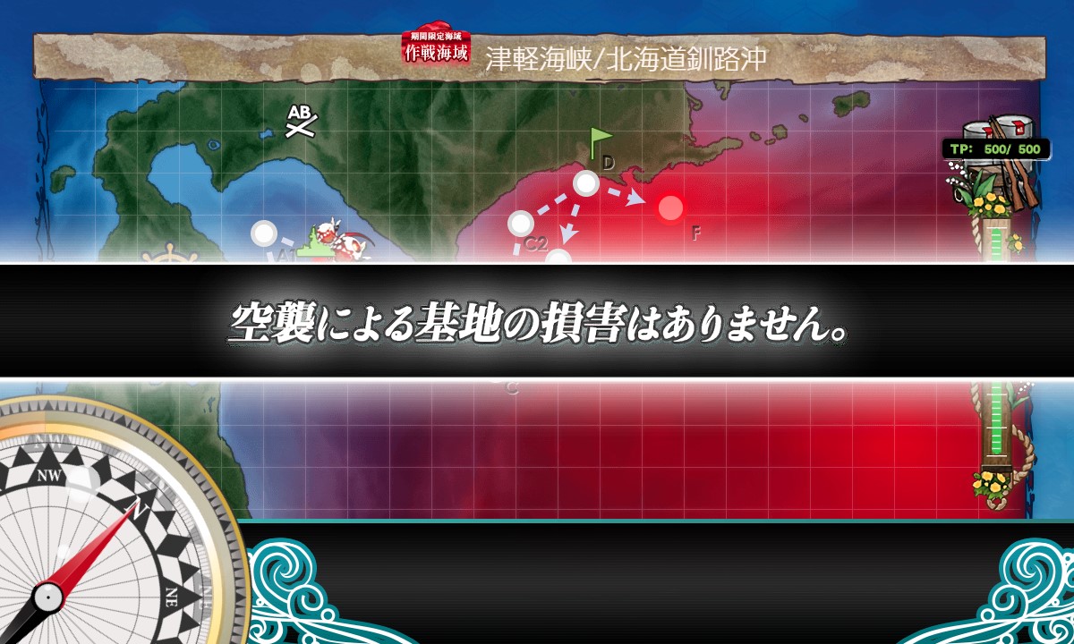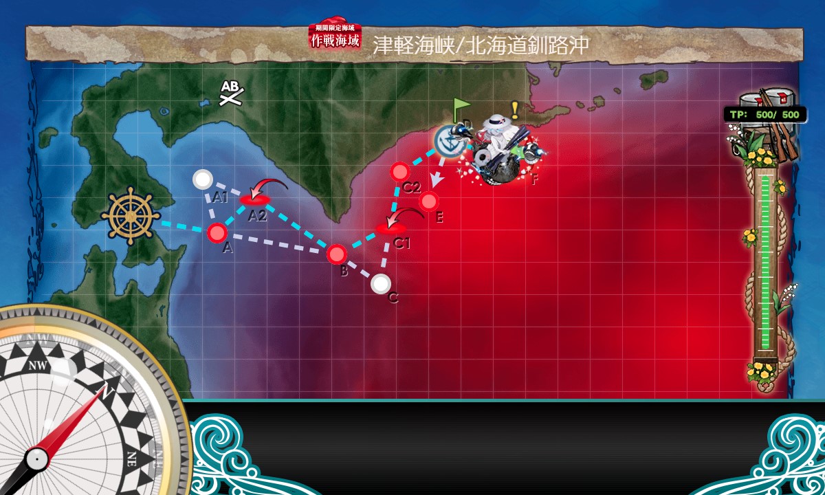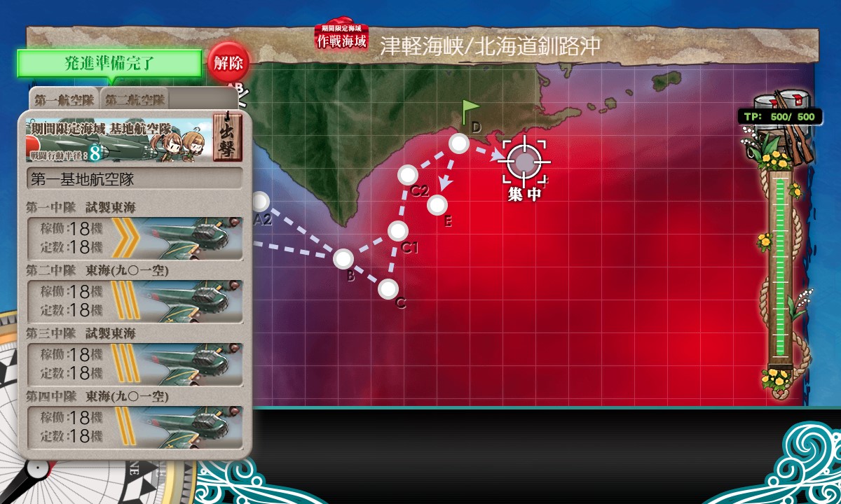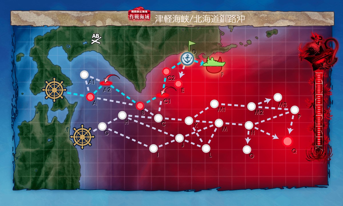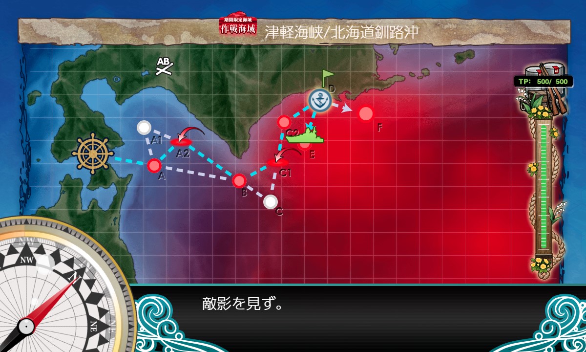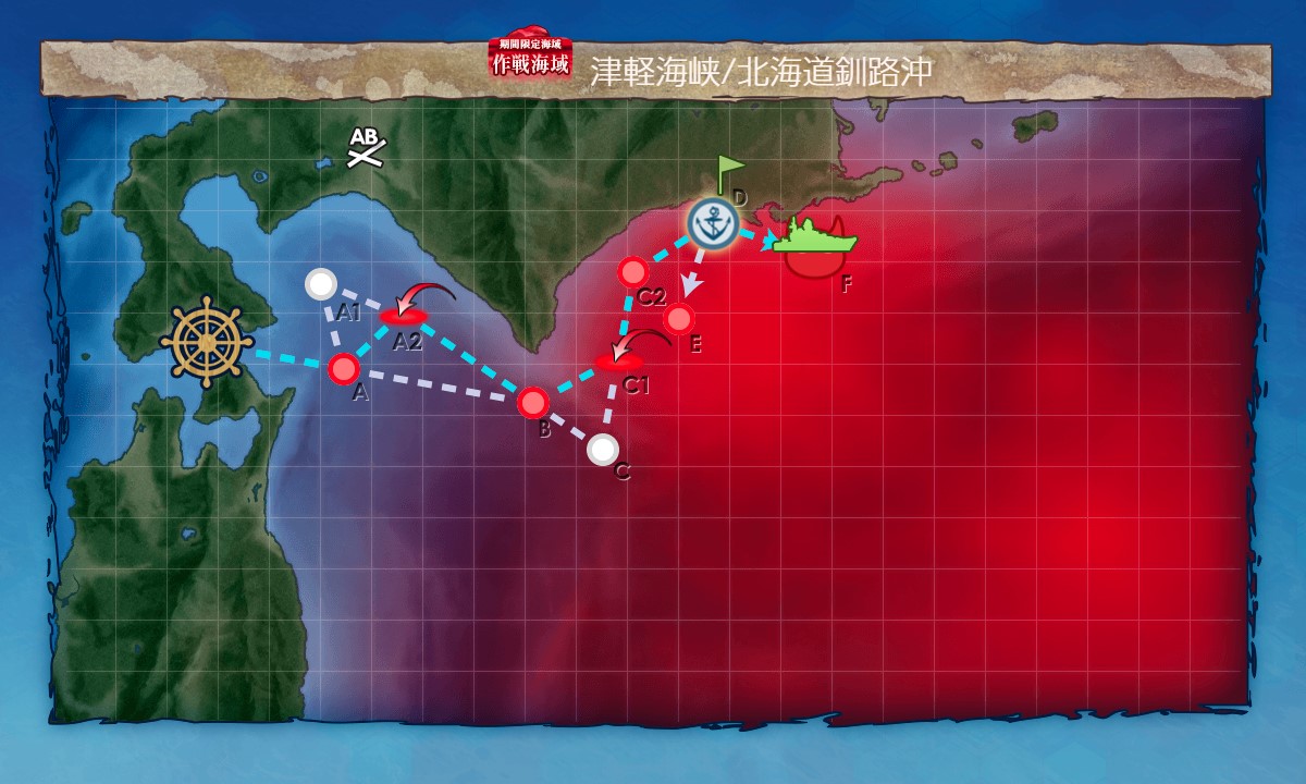 スタート→A:潜水(単横陣)→A1:空襲(輪形陣)→B:水上(警戒陣)→C1:空襲(輪形陣)→C2:水上(警戒陣)→D:揚陸ポイントと進行
