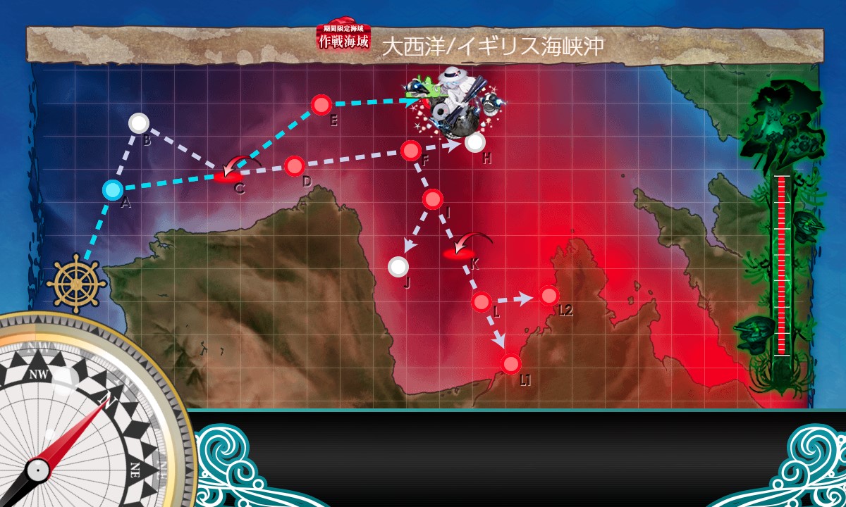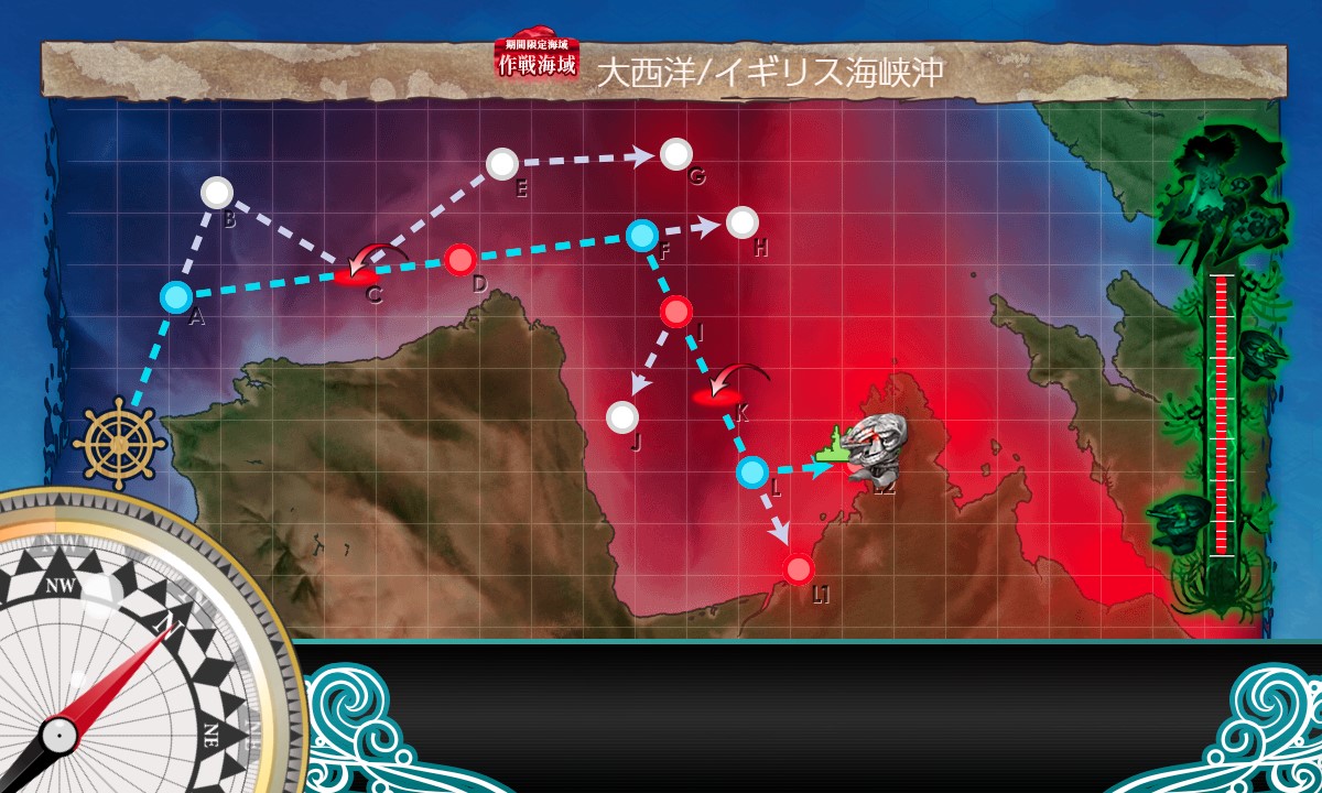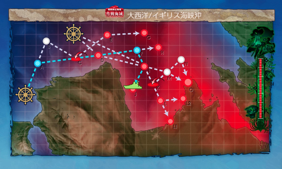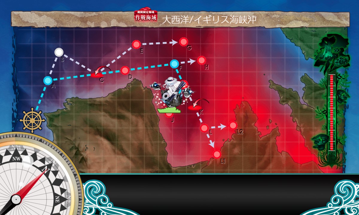 スタート→A:戦闘無し→C:空襲(輪形陣)→D:潜水(煙幕+警戒陣)→F:能動分岐→I:水上(単縦陣)→K:空襲(輪形陣)→L:能動分岐→L2:水上(単縦陣)、と進行
