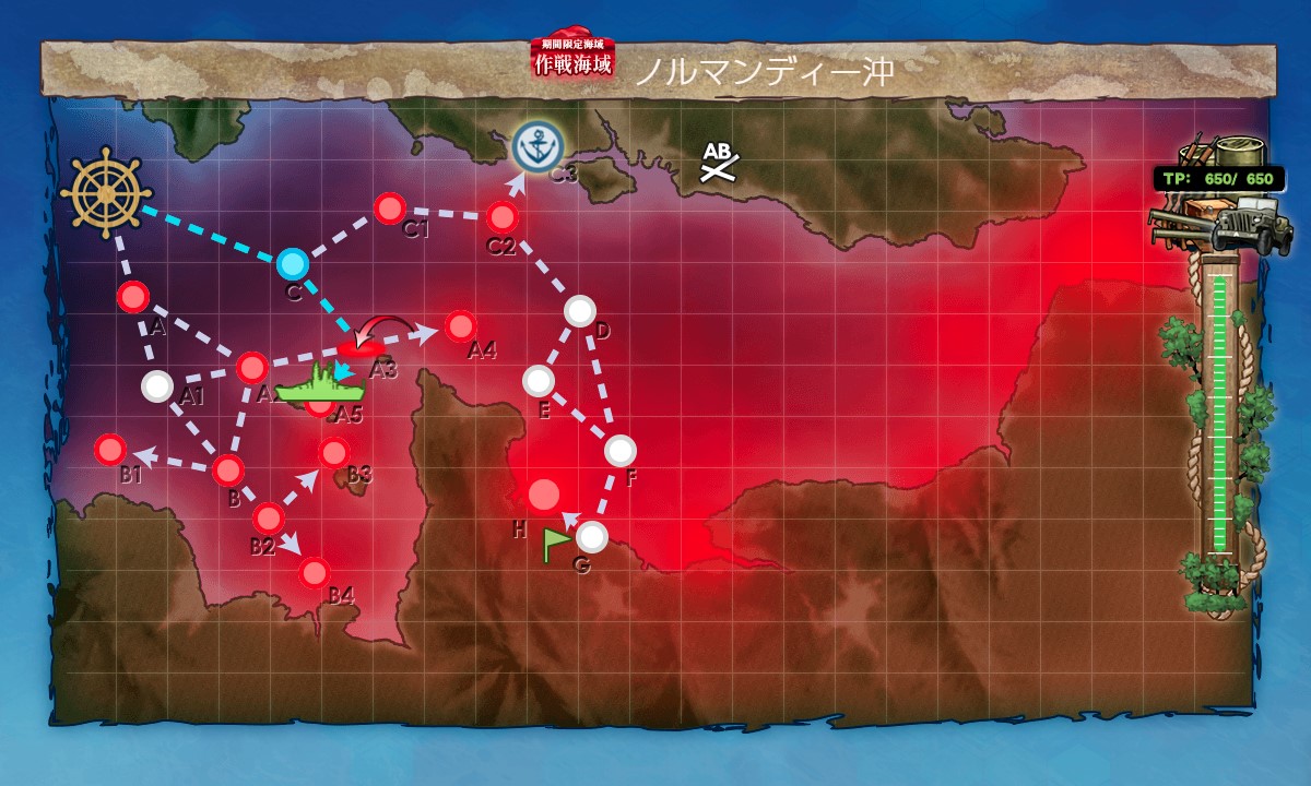 スタート→C:能動分岐→A3:空襲(第三)→A5:水上(第二)、と進行