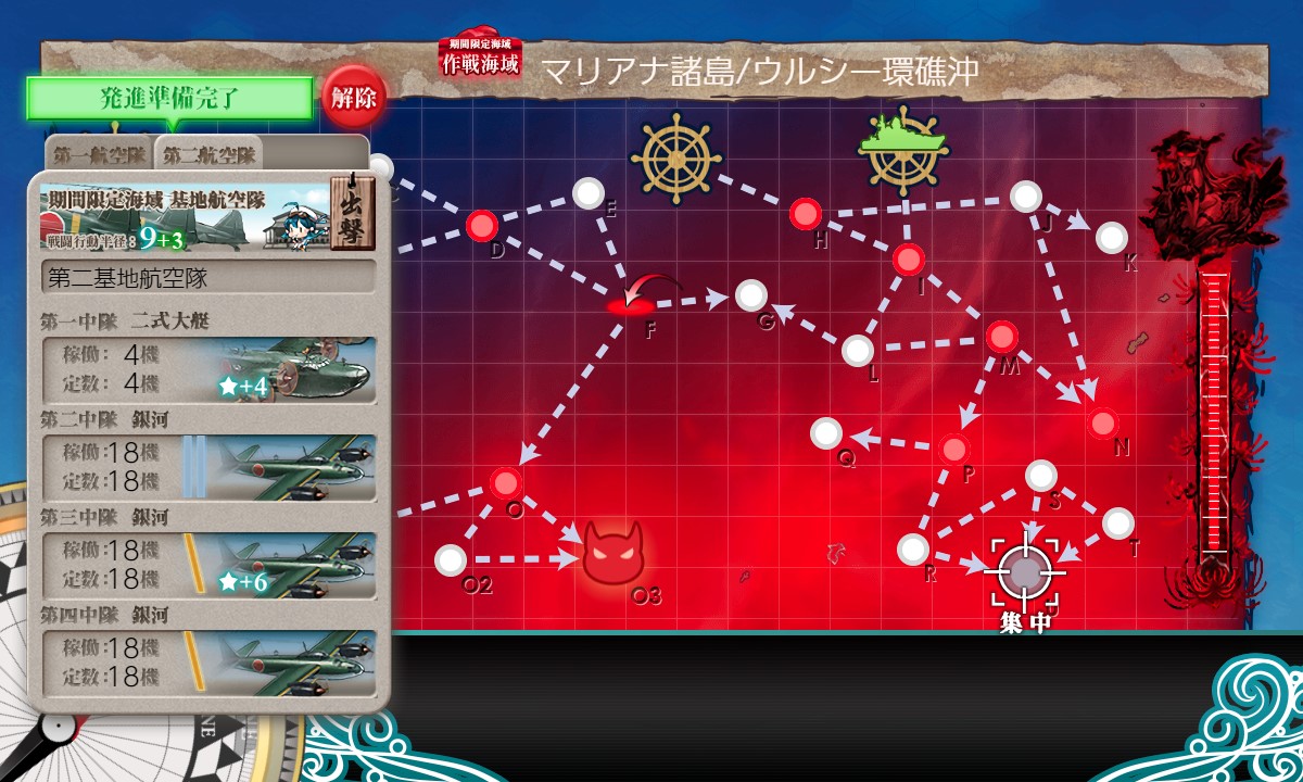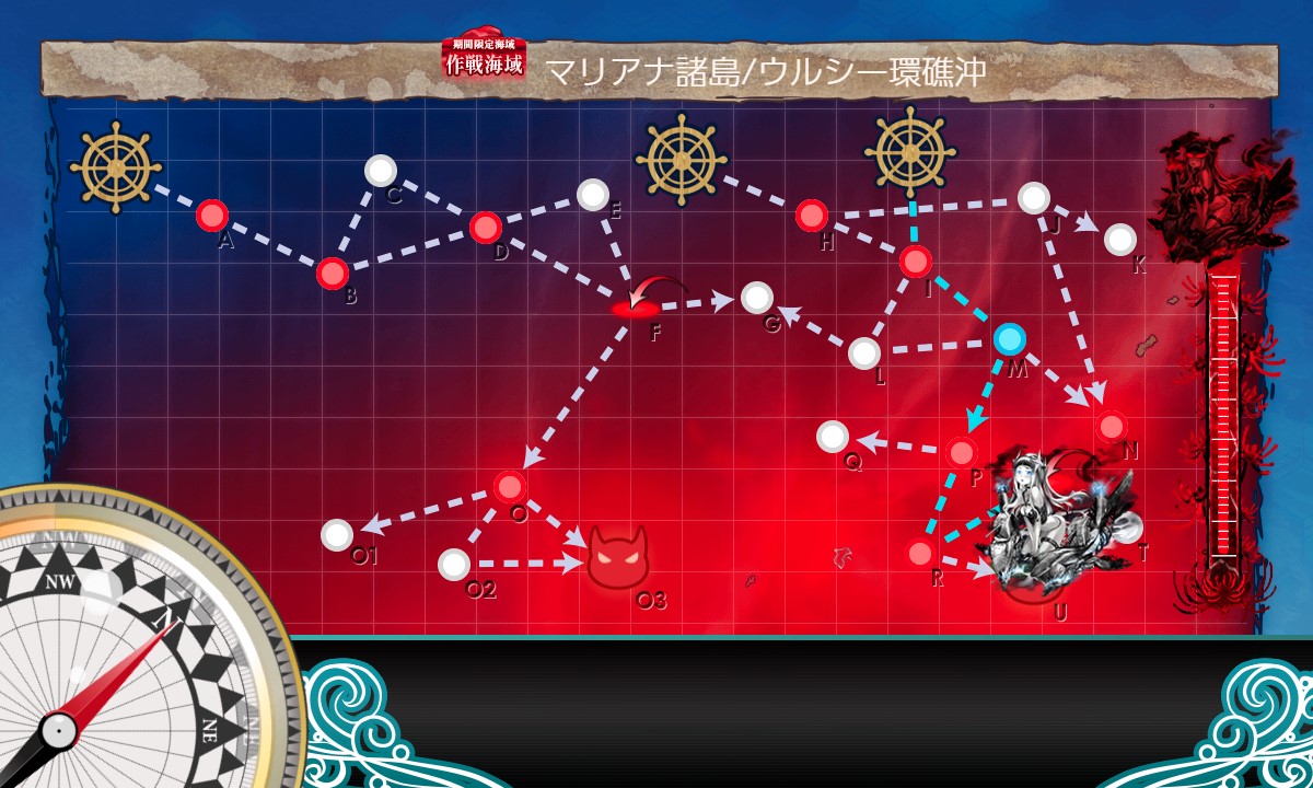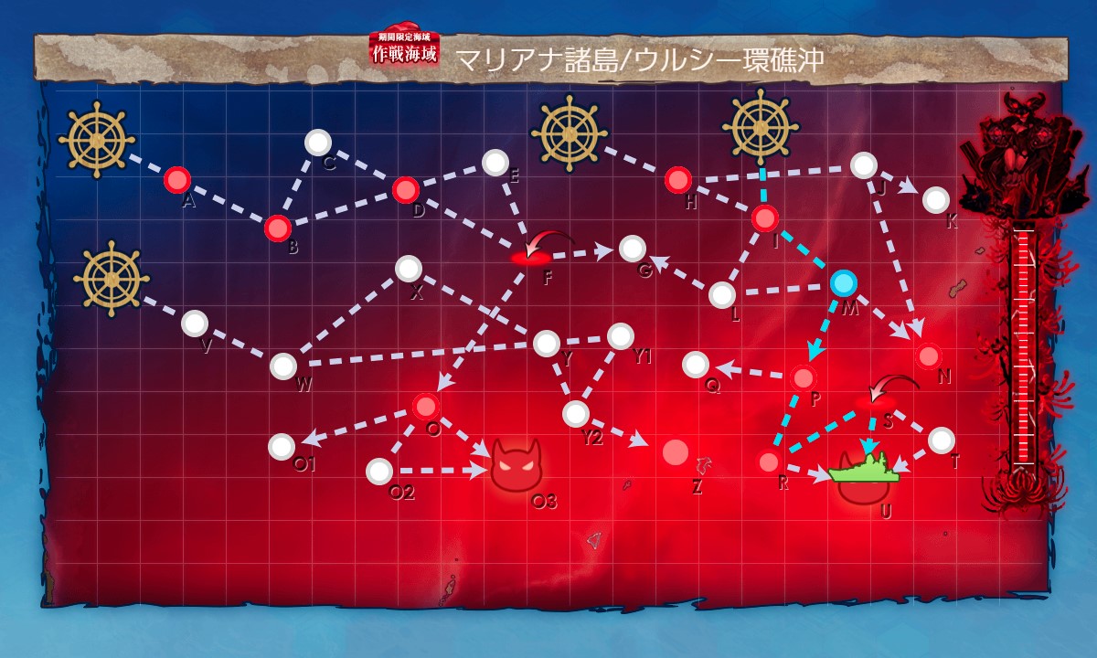 スタート→I:潜水(単横陣)→M:能動分岐→P:水上(警戒陣)→R:水上(警戒陣)→S:空襲(輪形陣)→U:ボス(単縦陣)、と進行