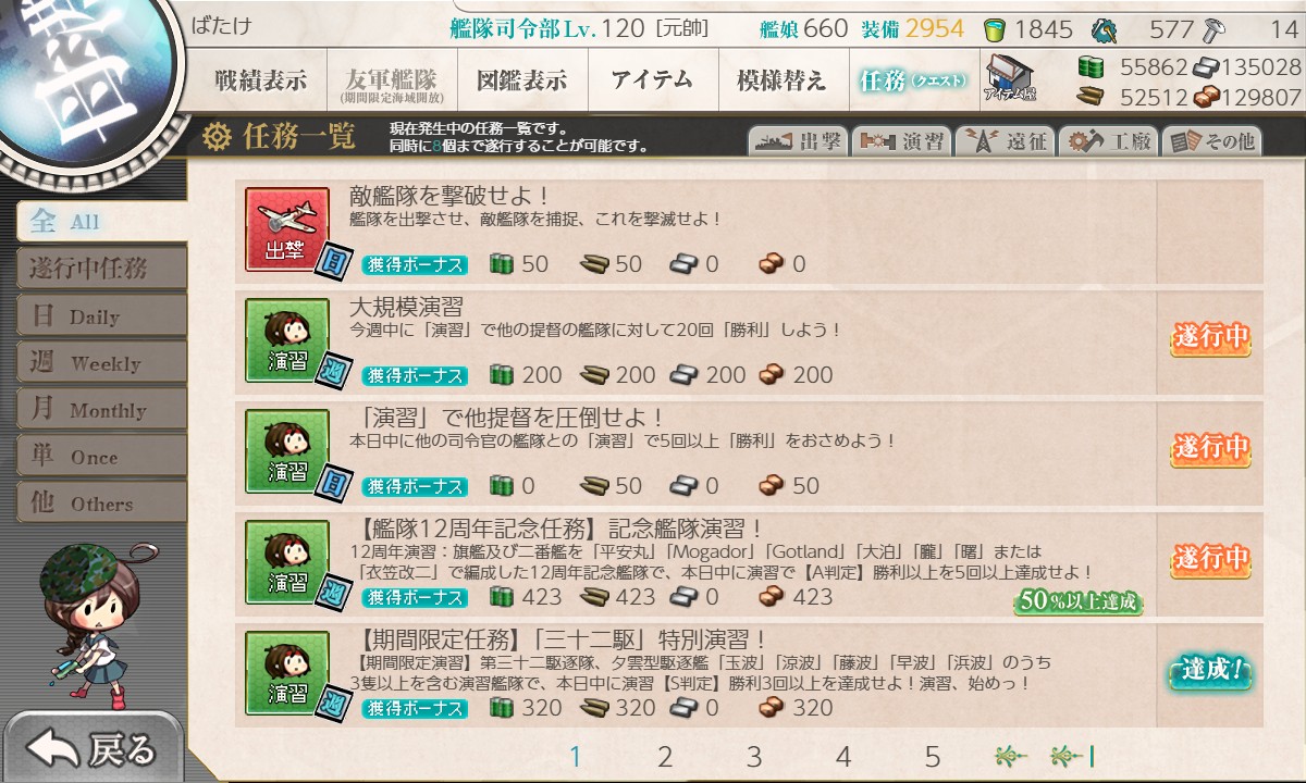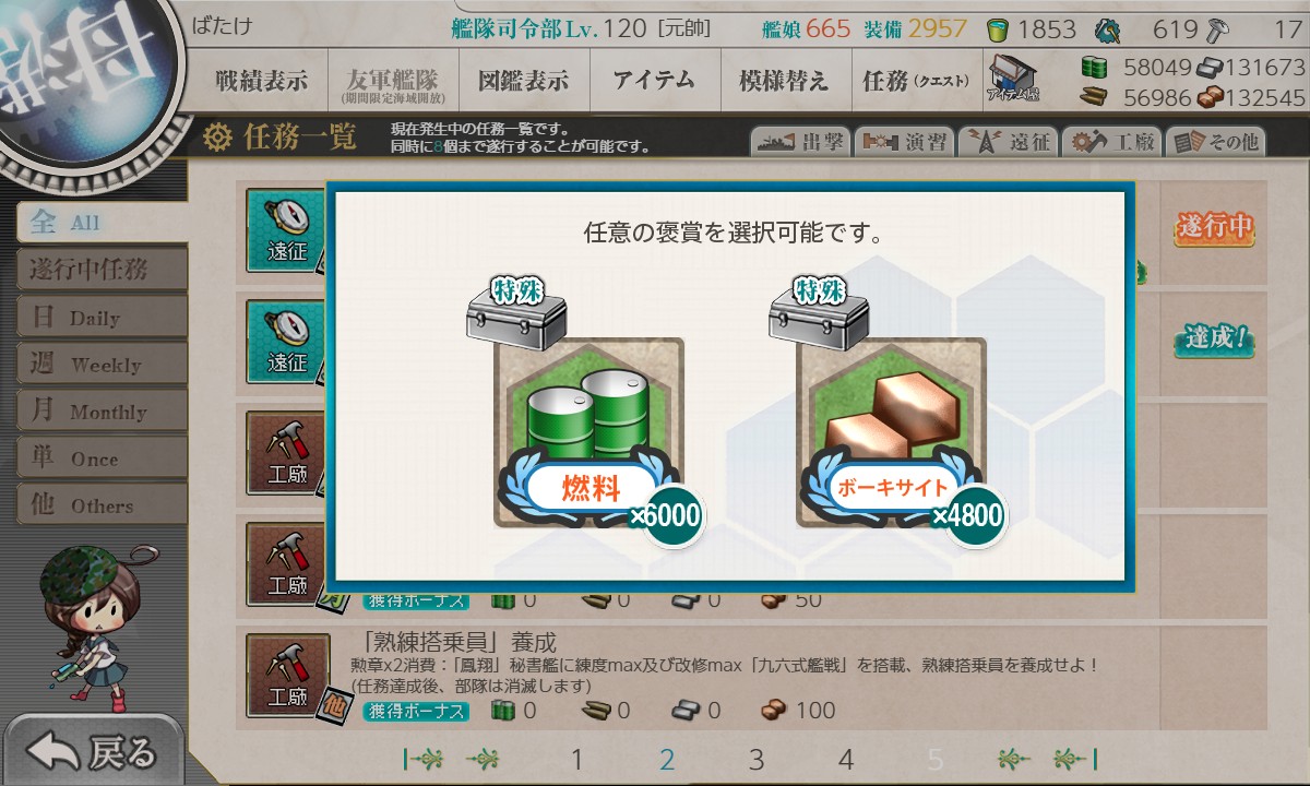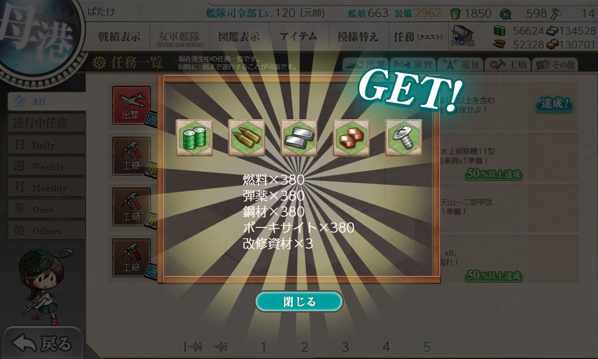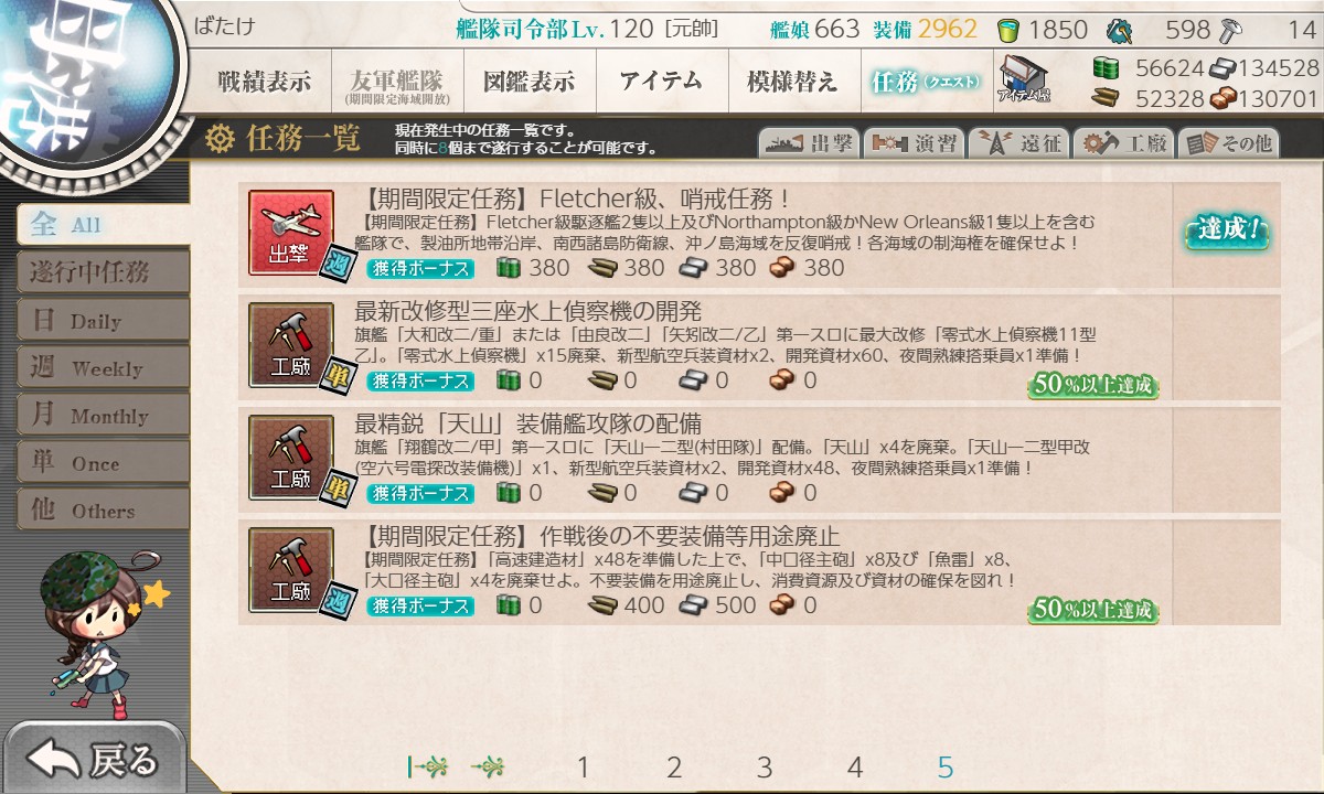 2025-05-19 開発 艦これ 今月のマンスリー遠征、全て大成功で完了 対戦相手に恵まれて演習任務も無事達成 【期間限定任務】Fletcher級、哨戒任務! 編成例(ウィークリー) | ぜかましねっと艦これ! 1-3 2回目 大破した機会に改造 1-4 2回目 2-4 2回目 とりあえずデイリー出撃任務は全て終わりました 続きはまた後ほど 一番回復し辛いボーキを貰っておきます